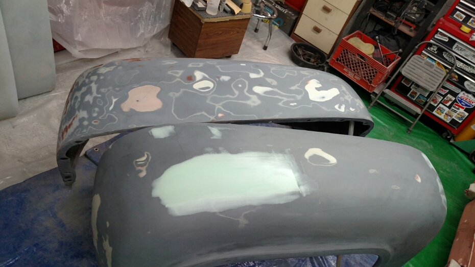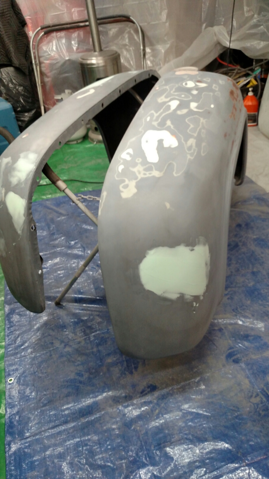 This just looks cool. I first seen this done in the 70s and just love the fat fender look from behind. A club member in the San Gabriel chapter of Pickups Limited did the widening, and I got to do the bodywork. He cut the flange and added 3″ them stitch welded them back together. I had the underside sprayed with TuffSkin bed liner (also under my running boards). Now this isn’t for the person in a hurry. It takes time to get it right. Especially on a curved fender. I will keep adding to this post since not finished with the painting of them.