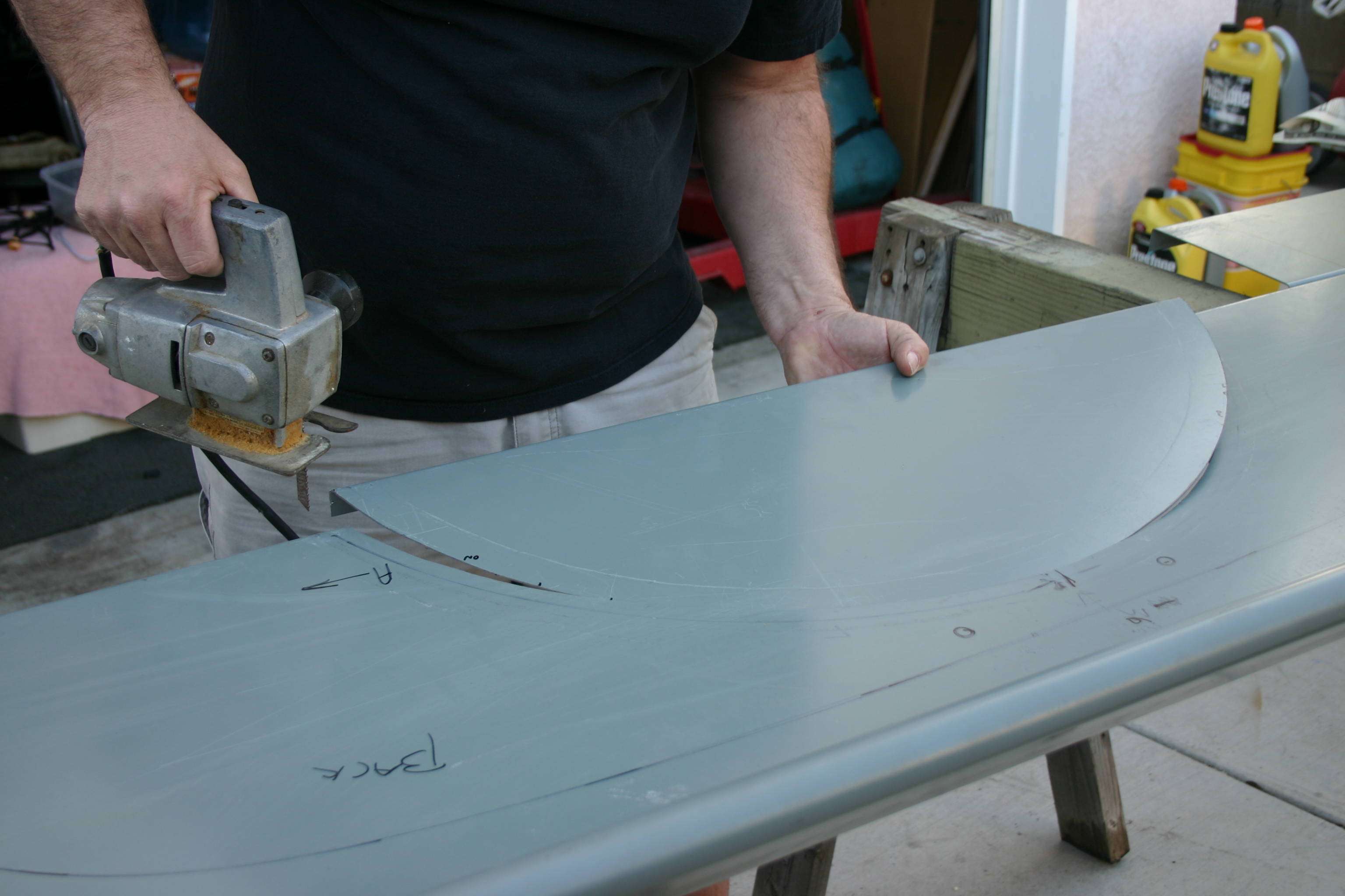 2-Measure once, measure twice, marks the area to be removed from the bed and measure and mark once more just to be sure. If you have doubts about where to cut, contact Dan Carpenter Specialties for additional information. The material where the wheel tubs will be installed is then removed using a jig saw as shown in the image. Thanks to Dale Beverly and members of Pickups Limited for help this day.