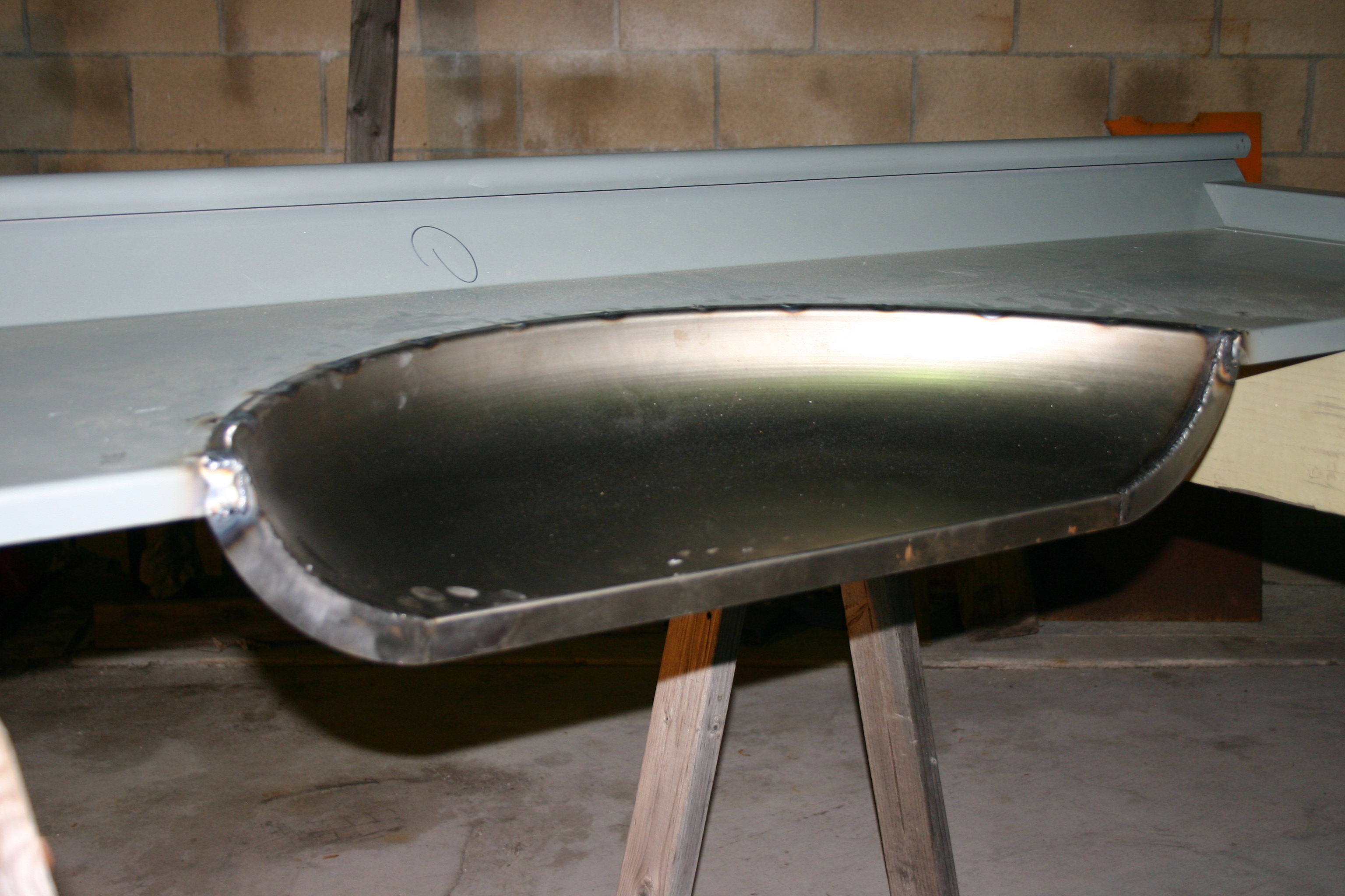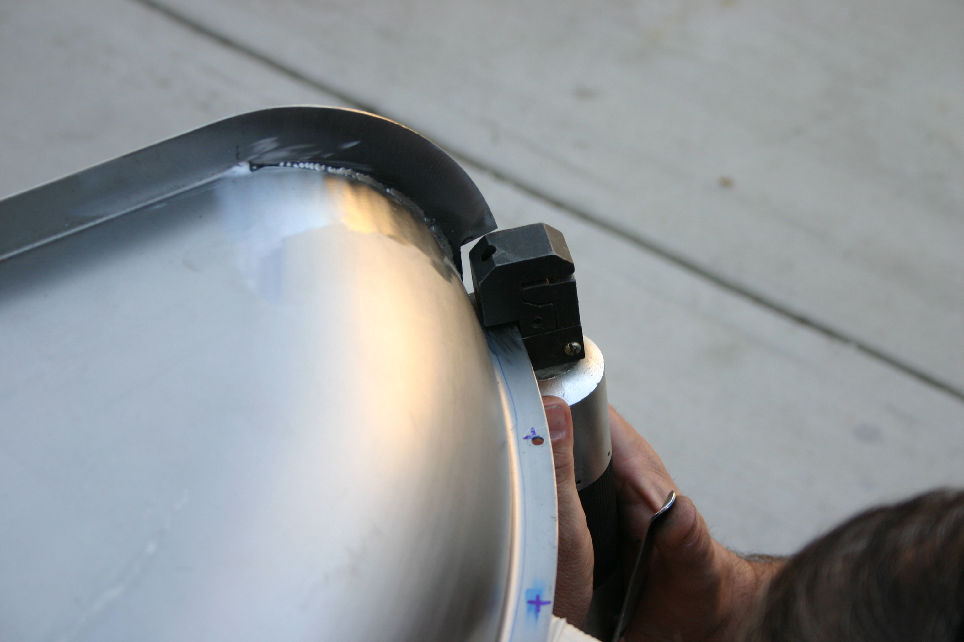 3-To permanently attach the Dan Carpenter bed tubs to the bed sides, we began by marking where attachment welds would be made through drilled holes, such as this one in the very corner and edge.