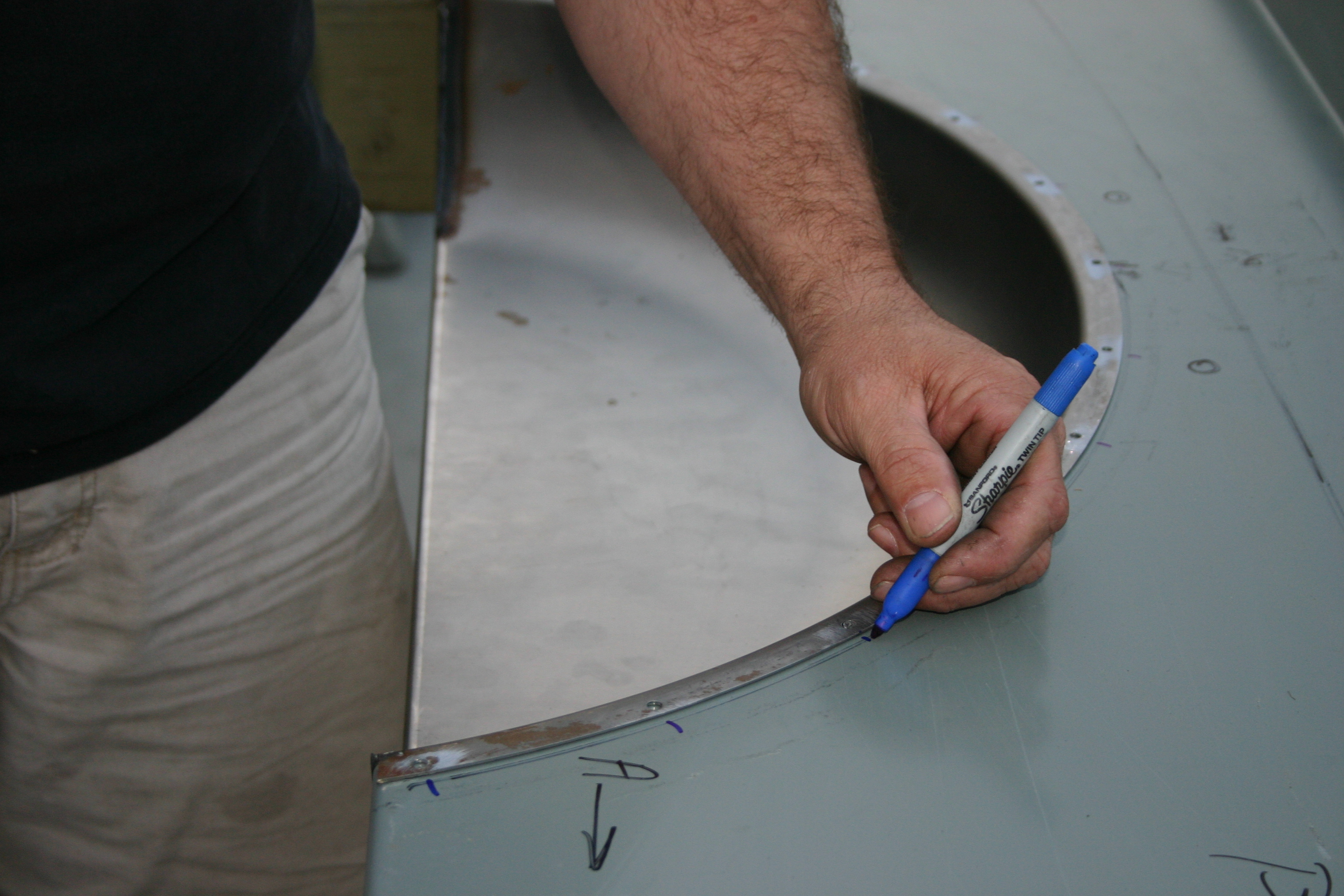 5-Again, you cannot be too careful when placing the bed tubs properly in the area to be welded. It is easier to mark and check you measurements several times than it is to redo them. Dale marks the location of the holes in preparation of removing the bed side’s primer.