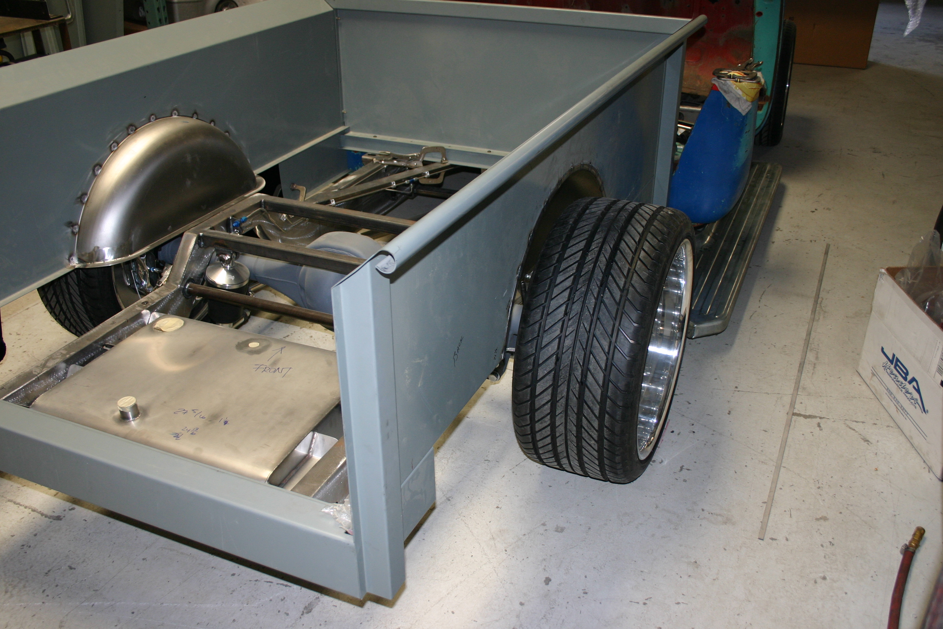 two bed boards down to the width of the frame rails and installing the inner fender bed tubs.