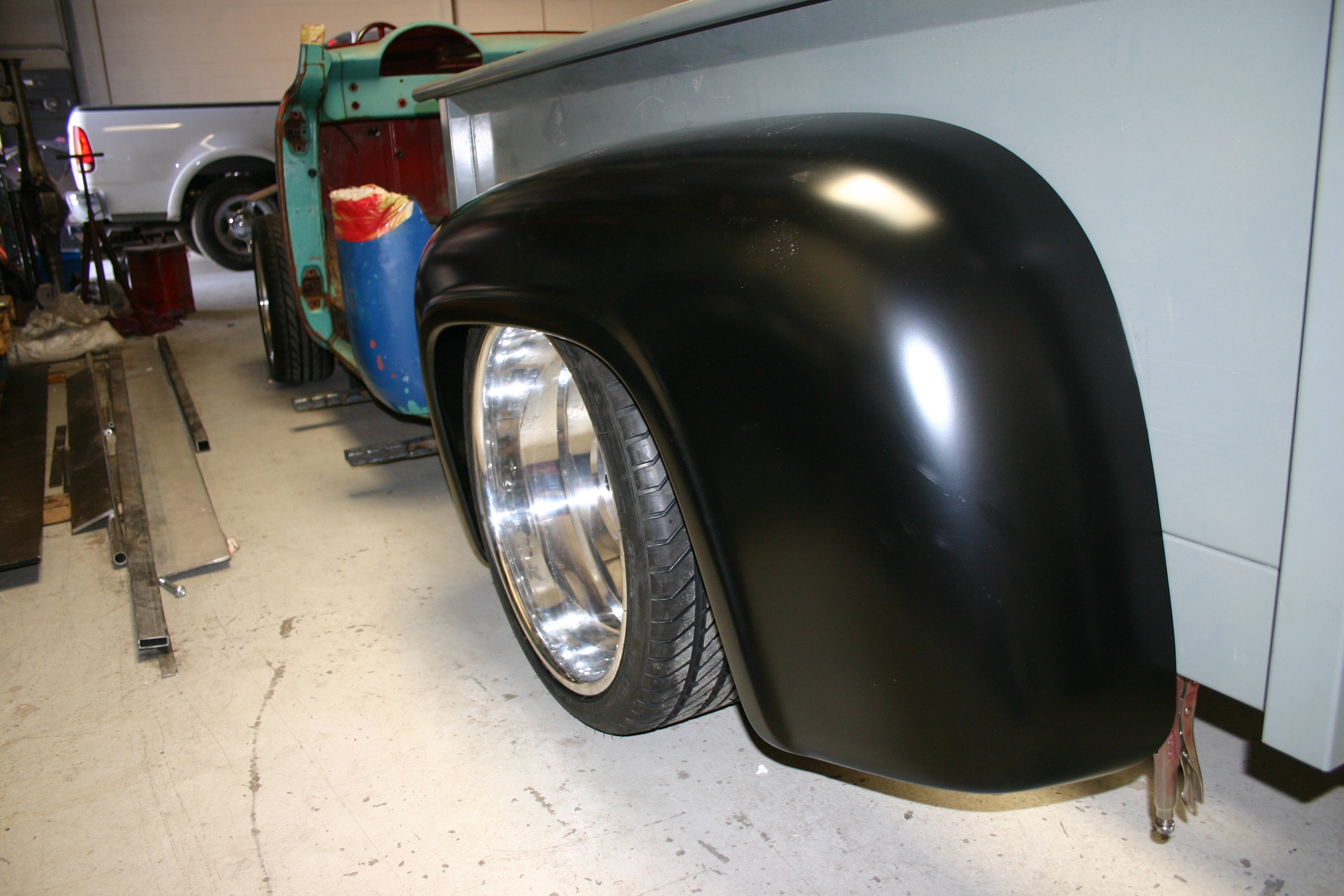 1-My 1956 Ford F-100 was looking so good without bed wood that I actually drove it for a year with the rear end showing. You can see just how fat the rear tires are, spread over the width of the Colorado Custom 10-inch wide billet wheels. The installation of Dan Carpenter bed tubs was necessary to create the needed space between the frame rails and rear fender lips.