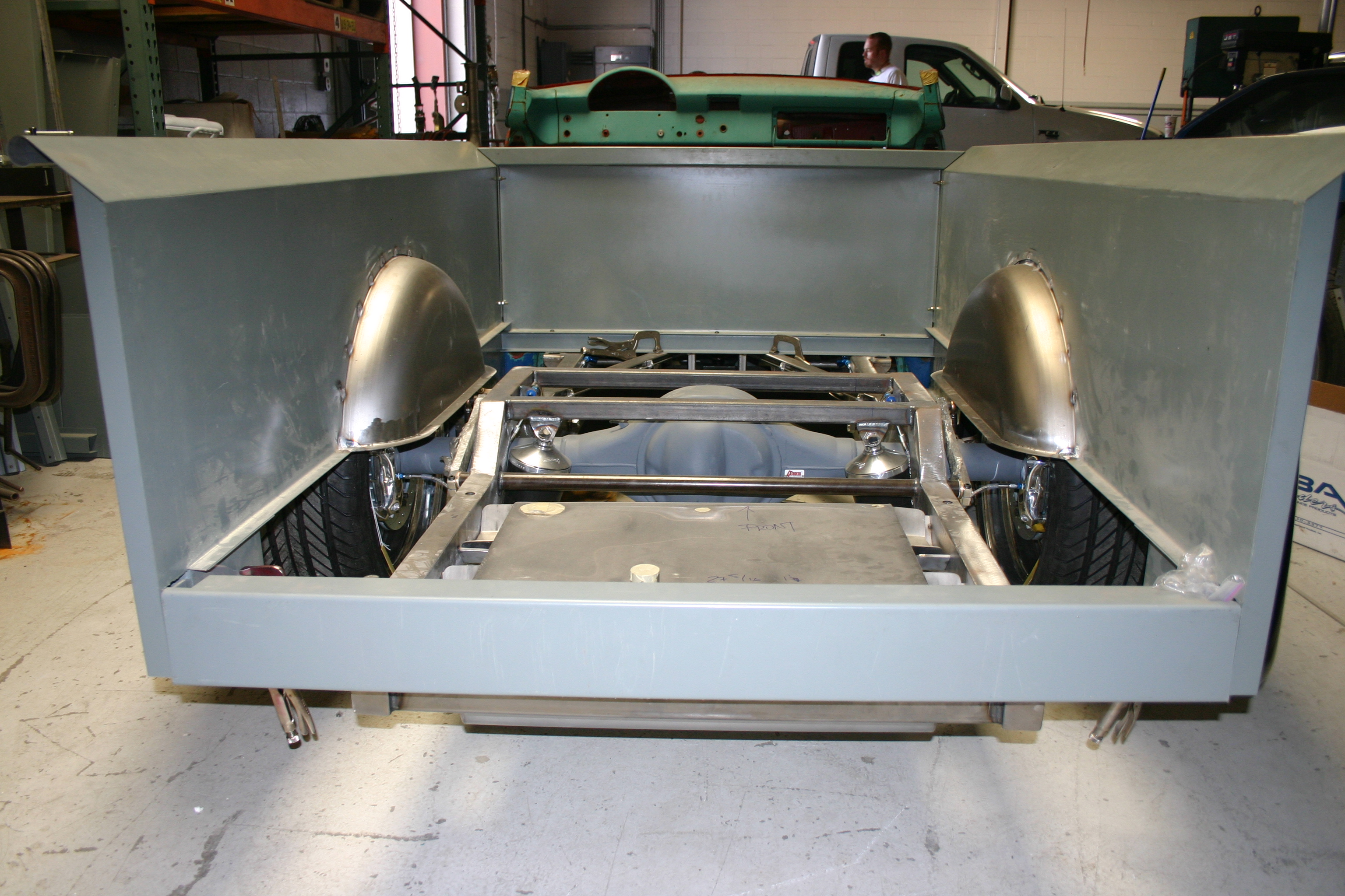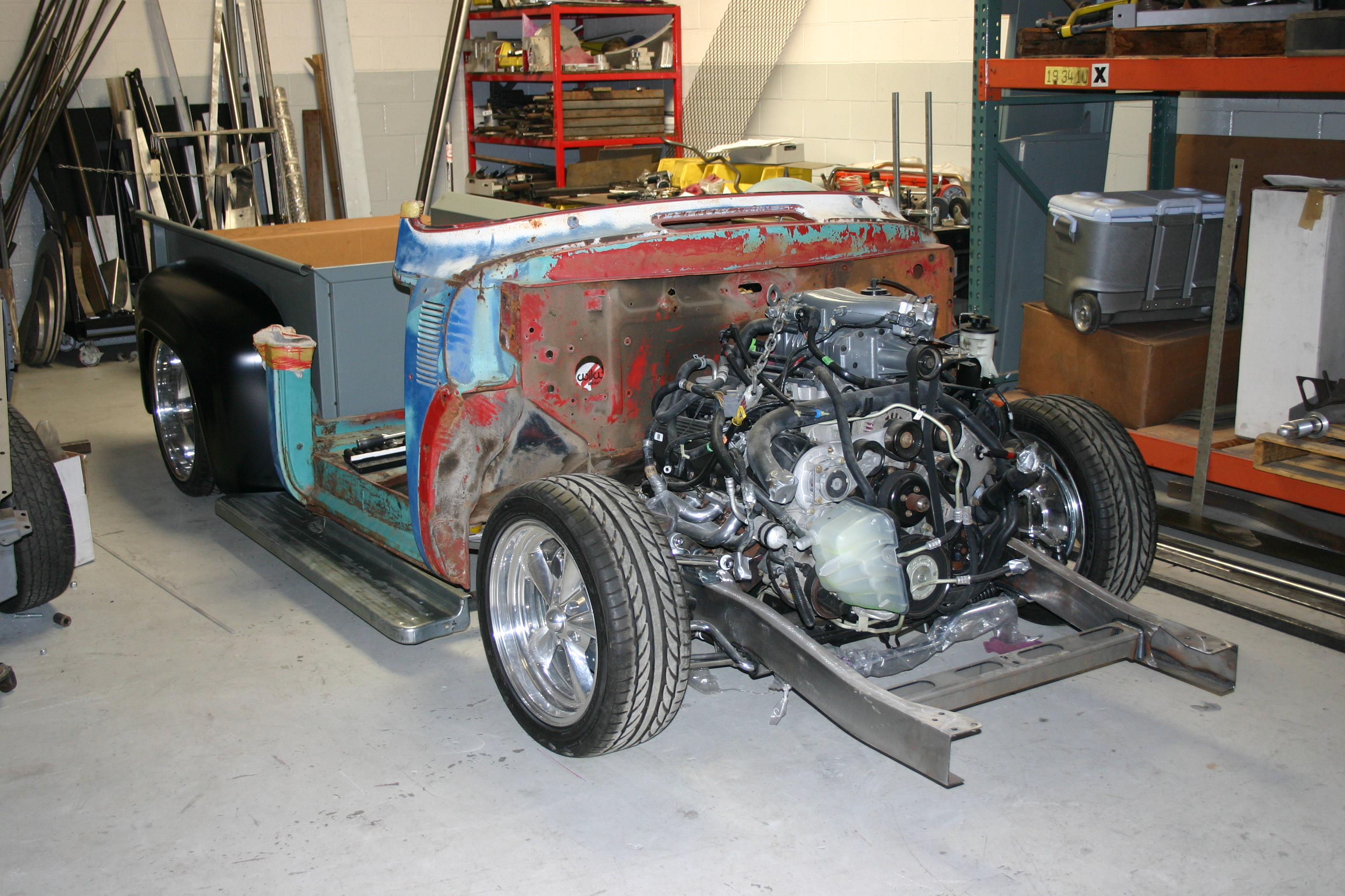 As you can see from the photos, I opted to pre-assemble this truck using a cut-up cab that the guys had in the R&D shop at Total Cost Involved, the manufacturer of the custom chassis. My son Cory and I assembled the bed and placed the proto type cab in place. We hung the bedsides onto the beds cross braces as well as brand new steel fenders. The tires, rear end width and bed sides were fighting for the same space as it just didn’t fit. At least not the way I wanted it to.