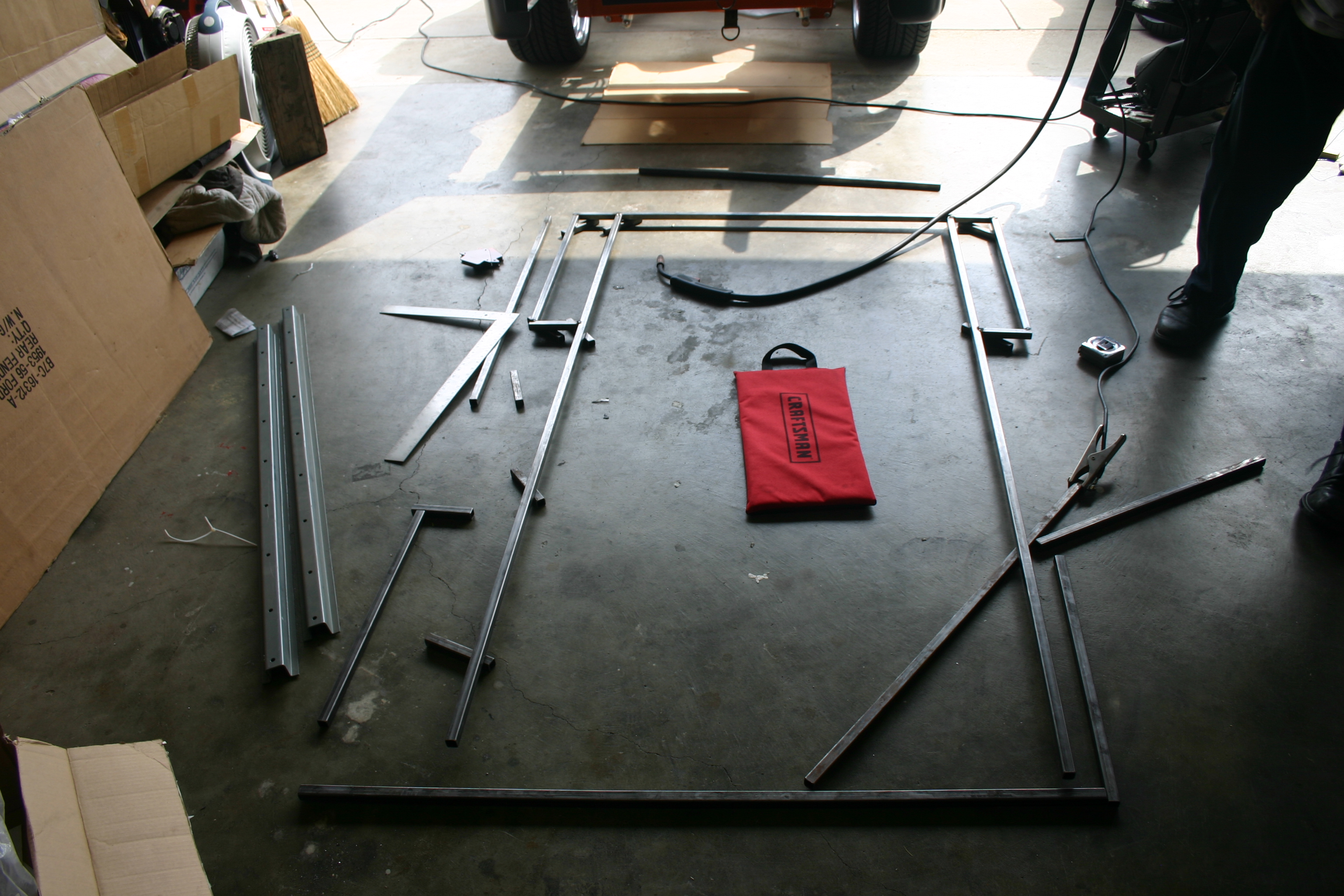 2- I purchased sticks of ¾-inch square tubing to be used to fabricate the bed wood’s sub frame. Bill Lee was there to help as we cut sections of tubing to fit around the wheel tubs and run front to back and side to side. We tack welded the corners just to get started.