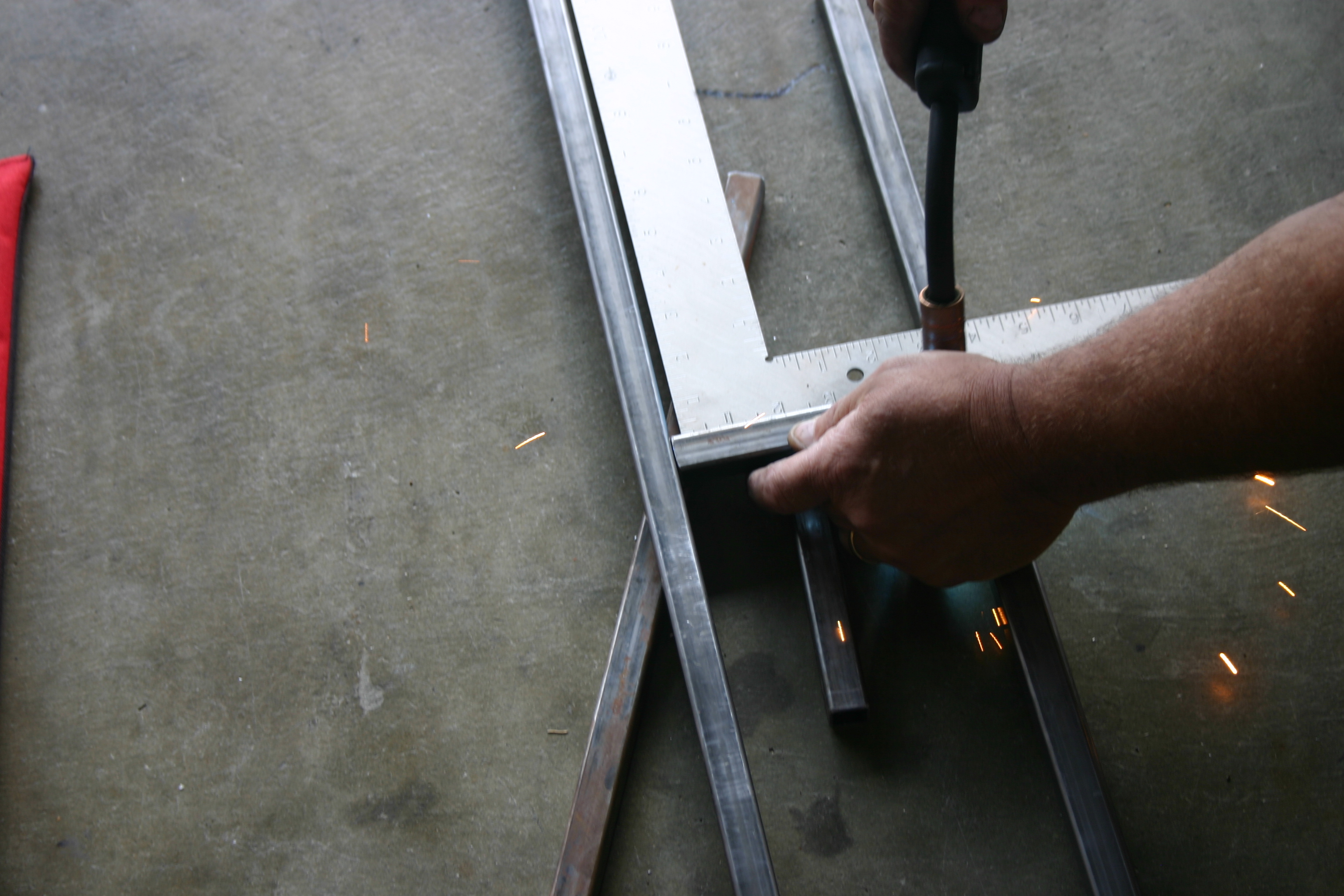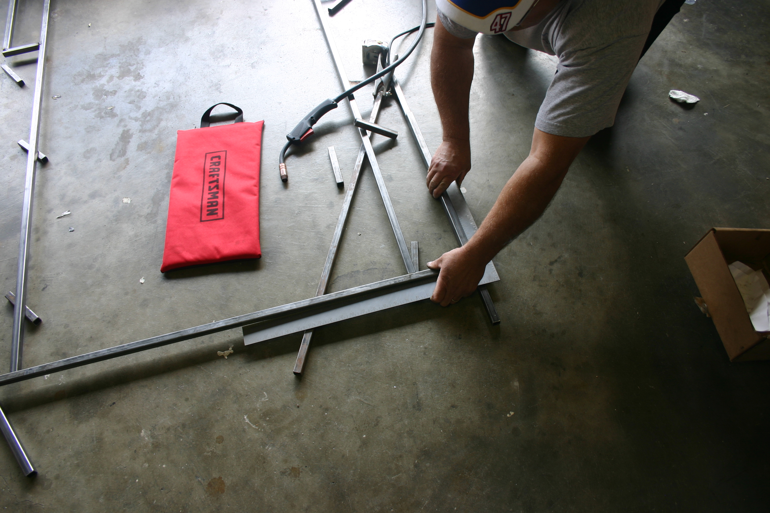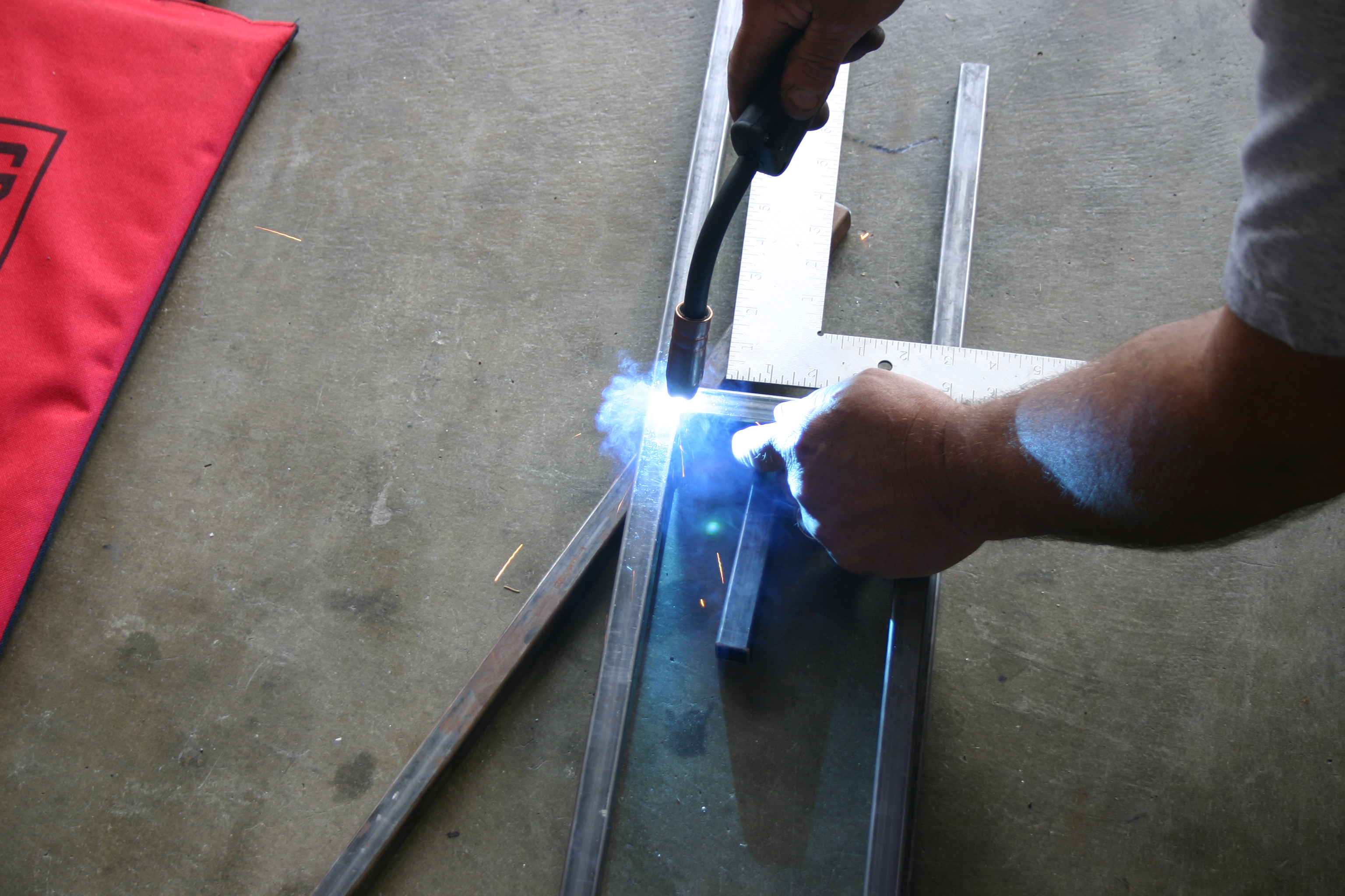 3- After checking the bed to ensure it was totally square, we squared up the first corner of the tubing in preparation to welding it in place. A light-duty Miller MIG welder works great for this type of metal fabrication.