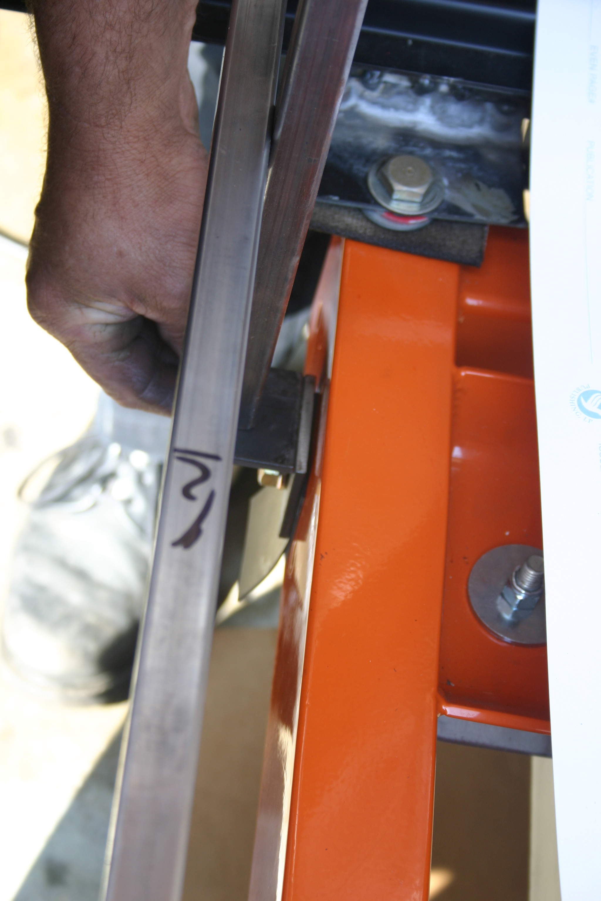 9- Another flat plate was mounted to a bed bolt and a support strut cut to fit from the plate to the height of the bed frame. This one is just forward of the wheel tub for added support.