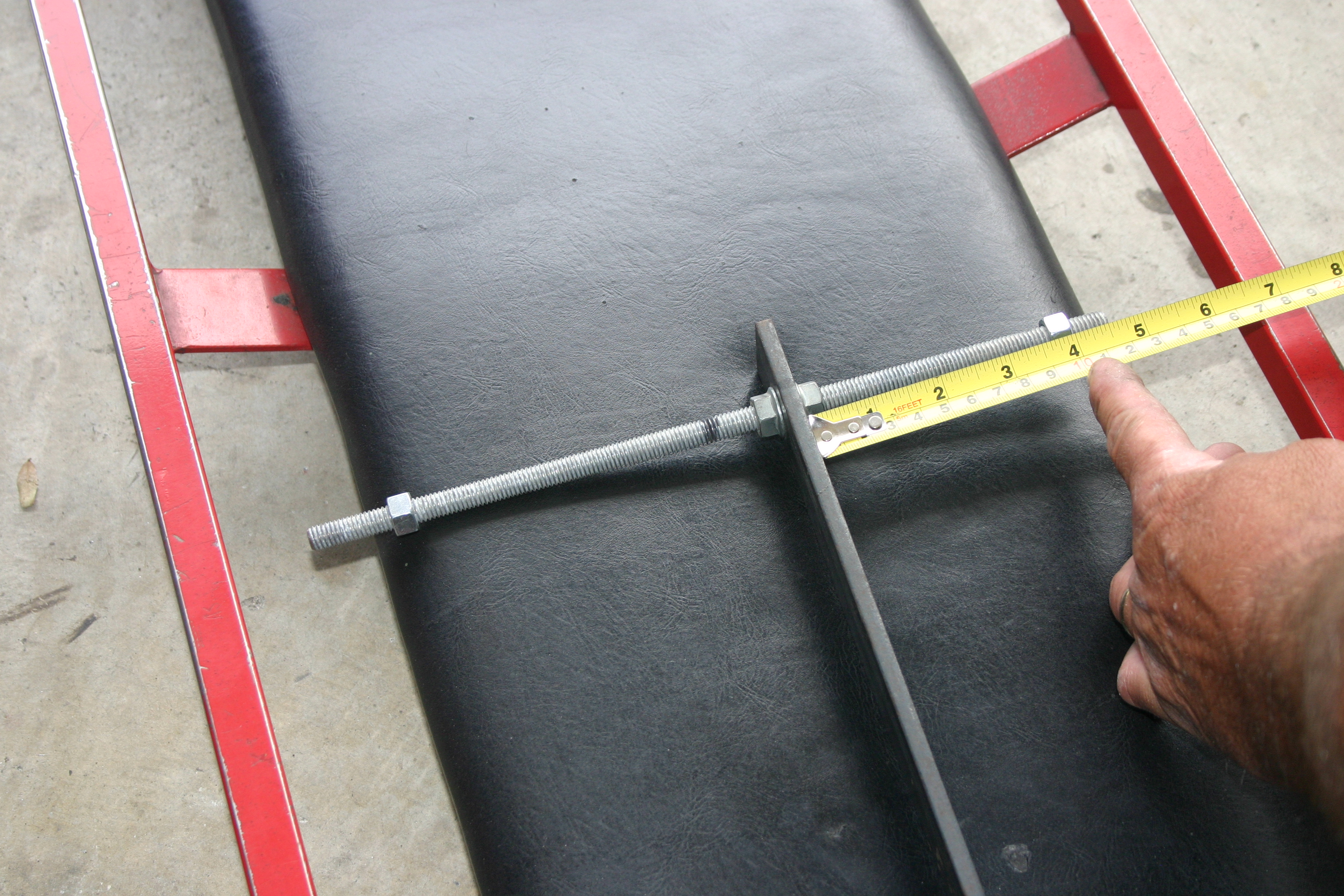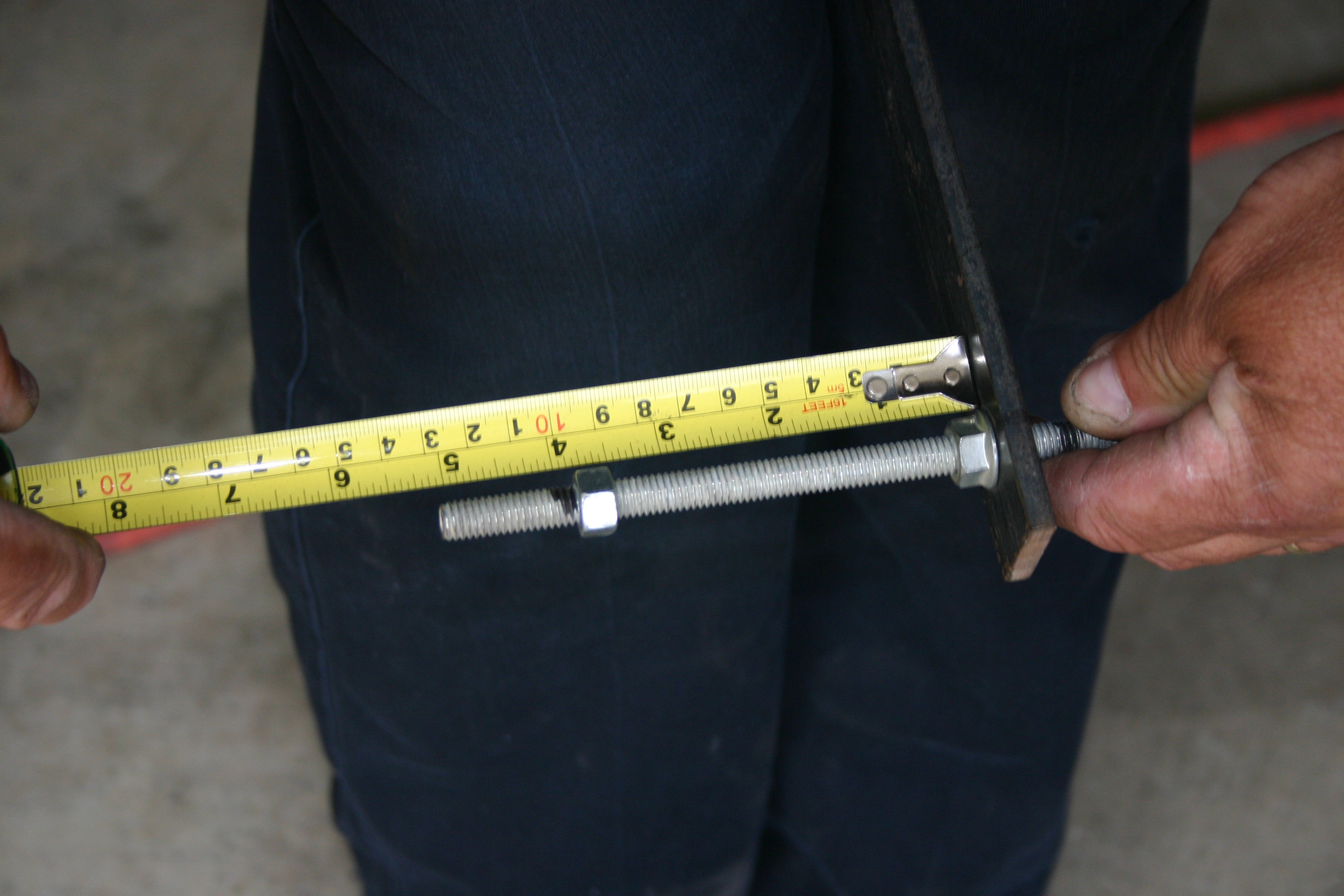 7. Next we will measure twice and check twice to ensure the wheel back spacing is transferred to the threaded rod and again, indicated by the placement of the outside nut. We used a marker to ensure this measurement is again correct. With a sharp eye, you can see Bill set the rod with 6 ½ inches on one side and 4 ½ inches on the other with is the overall width of the wheel and inflated tire.