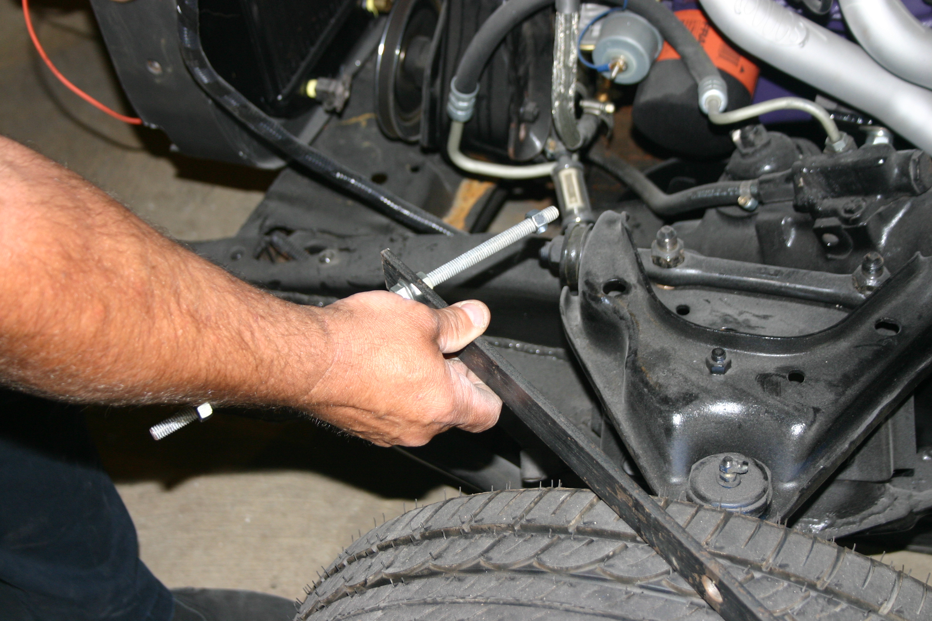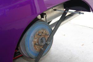 8. Once again the flat bar is mounted onto the brake drum and the rod is slowly rotated into position. We aren’t just lucky, but good as the wheel/tire combo with the unique off-set will clear with no problems. As a matter of fact, Bill has discovered that he can also position the wheels closer to the fender utilizing thin spacers if he so desires.